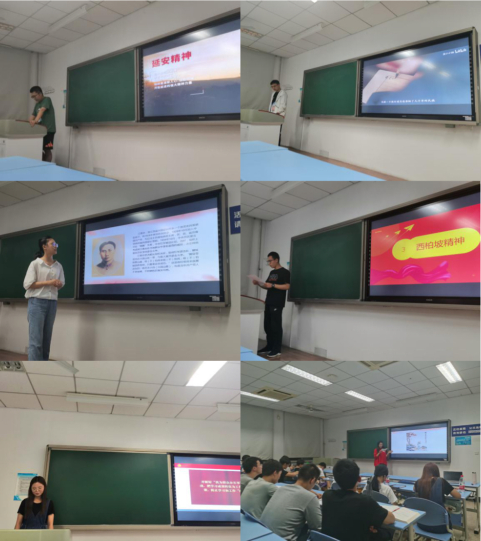 接下来,团支部同学开展人人讲党史活动。同学们精心挑选自己想要分享的党史故事,或以口述、或以PPT放映、或以视频播放等方式活灵活现地讲述党史。从中国共产党建立初期的艰难过程,到习近平总书记在中国共产党成立100周年大会上的讲话,跨越100周年,中国发生了翻天覆地的变化。漫漫一百年历程,有的同学选择自己的家乡,讲述家乡的党史故事,如西柏坡精神、洛阳抗日史、延安精神等,有的同学选择讲述具有代表性的会议和战役,如遵义会议、长津湖战役、对越自卫反击战等,有的同学讲述毛泽东、周恩来等的伟人故事,从我们熟悉的人物中聆听故事、学习精神。还有革命先辈瞿秋白、中国航天之父钱学森、感动中国2019年度人物杜岚......每一个人物,每一个事迹,蕴含着讲述者对他们的敬意,激发了同学们的爱国热情。