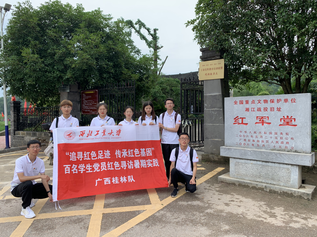 当日下午,实践队员们驱车前往位于兴安县界首镇的红军堂,它地势较高,周围无任何遮掩物,极便于观察渡口四周的情况,彭德怀曾在红军堂指挥部里,亲自指挥部队保护界首渡口浮桥,掩护中央纵队、军委纵队渡江,至今红军堂庙墙壁上是弹迹累累。