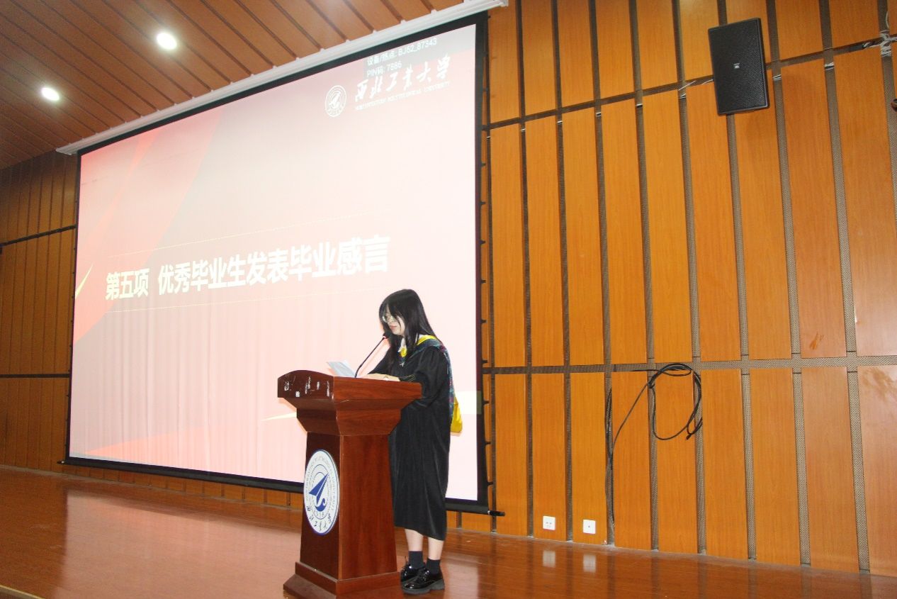 万海东和夏勇为优秀毕业生颁发证书。优秀毕业生黄卓远作为毕业生代表发表毕业感言。她分享了自己的大学经历和对未来的展望,表达了对家人、老师、朋友的感谢,感恩学院和母校的培养,为本届毕业生送上了祝福。
