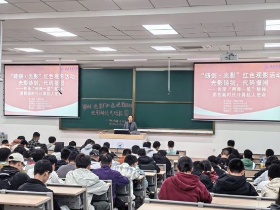 2025级本科组织“铸剑・光影”红色观影活动,学生们在教学西楼D201教室集中观看影片《横空出世》。观影前,辅导员韩淑捷老师介绍了中国三级片