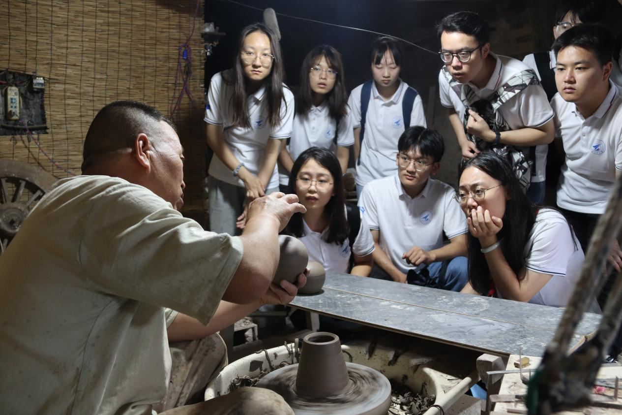 在拜访了刘师傅之后,实践队员一行人前往当地民窑实地观察了瓷器形成的产地。如果没有相关人员的介绍,实在让人很难相信地上水泥一般的材料便是制作陶瓷的主体材料,陶缸中方式的细腻的“流沙”竟然会在日后被技艺者制作成厚重精美的瓷器。实践队员也在陶瓷学徒的帮助下亲手尝试了制作黑瓷的过程,用脚小心控制着转盘的转速,双手细致地将一团土胚捏成自己想要的形状,这么一个创作的过程,让所有队员都惊呼奇妙。