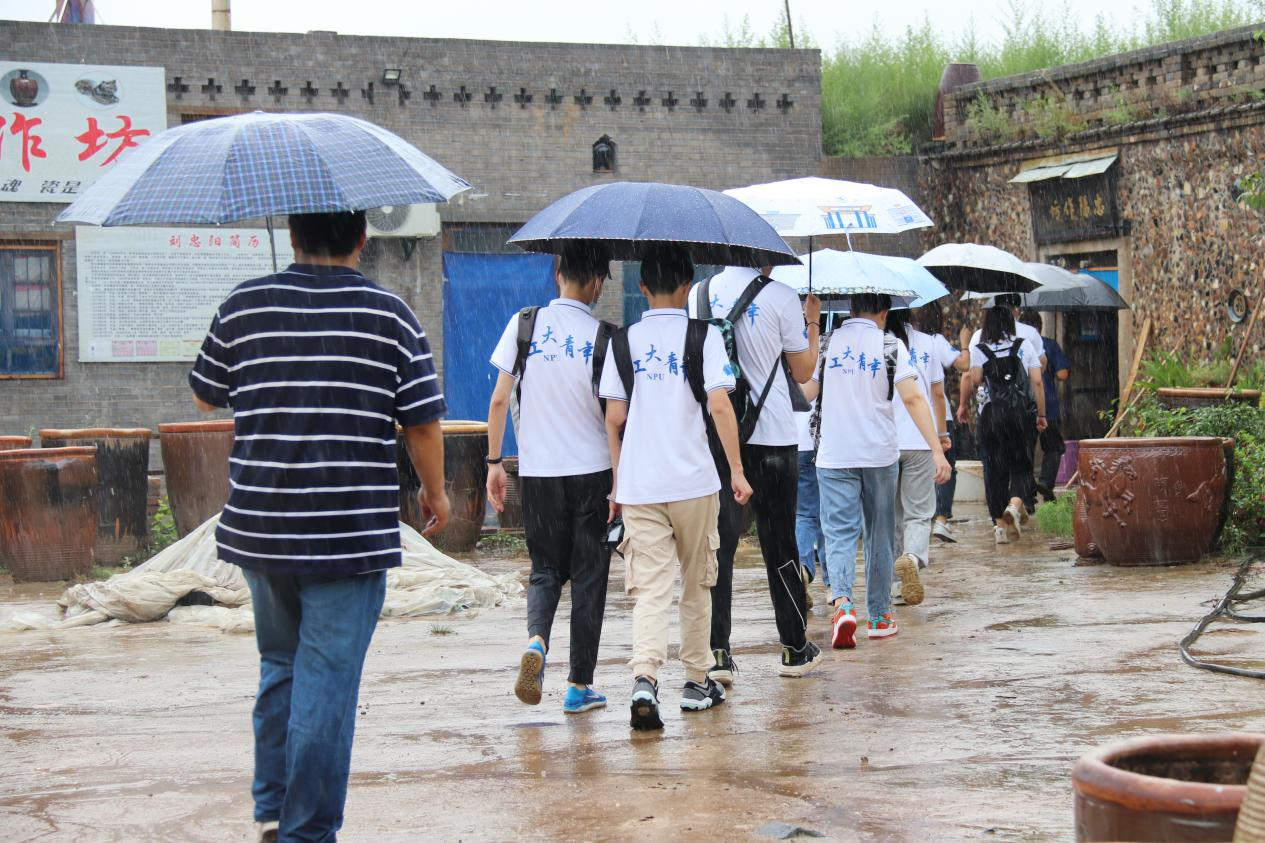 “走进乡村非遗,探寻振兴之路”社会实践队迈上了前往渭南市尧头窑的路上,途中大雨倾盆,尧头窑在大雨的侵蚀下更显得沧桑古朴,泥土、夏雨、历史、陶瓷等无数气味在这片土地混成了一副错杂的画面进入实践队员们的脑海中,黑瓷终于在两个小时的颠簸后解开了他的神秘面纱。