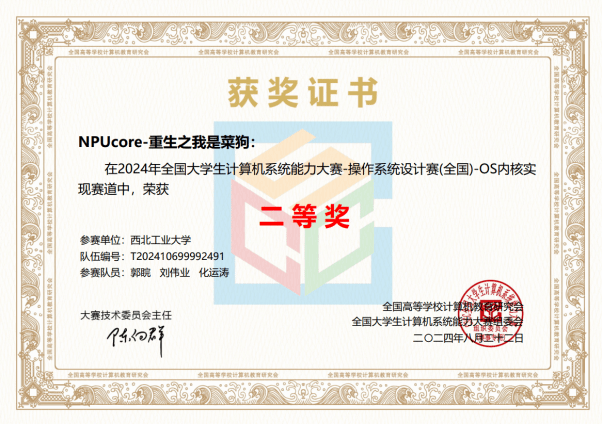 本科生郭睆、刘伟业、化运涛组成的“NPUcore-重生之我是菜狗”队伍队获得内核实现(基于国产龙芯LoongArch硬件)赛道二等奖(亚军)。该队基于2K1000平台使用Rust语言开发了SATA驱动程序,成功通过块设备功能和性能评测;实现了网络模块,支持TCP/UDP协议,成功通过netperf网络测例,成为首个满分通过初赛测例的战队。