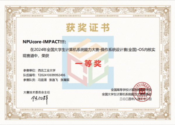 本科生冯宜湑与软件学院张逸飞和网安学院张瀚宸组成的“NPUcore-IMPACT!!!”队获得内核实现(基于国产龙芯LoongArch硬件)赛道一等奖(全国冠军)。该队设计和开发的NPUcore-IMPACT(银派核)操作系统内核基于Rust语言编写,可在基于国产龙芯架构的2K1000开发板及其虚拟机上稳定运行。银派核不仅支持106个系统调用和FAT32/EXT4文件系统,还根据龙芯LLVM架构提出了NPUcore-lwext4版EXT4文件crate包,首次针对龙芯2K1000开发板的SCSI方法上板成功,成为该赛道全国唯一libc-bench得分队伍,初赛和总决赛均取得全国最高分。