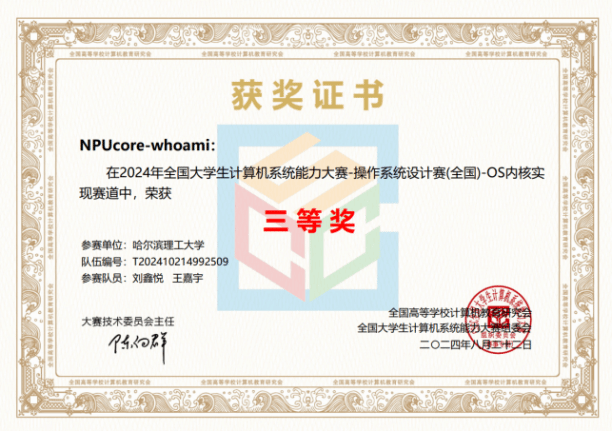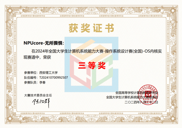 另外,“NPUcore”战队中还有来自哈尔滨理工大学刘鑫悦、西安理工大学李春同学,分获全国总决赛内核实现赛RISC-V赛道三等奖。