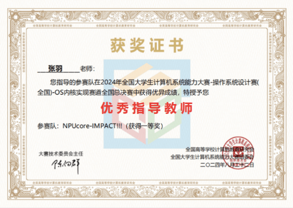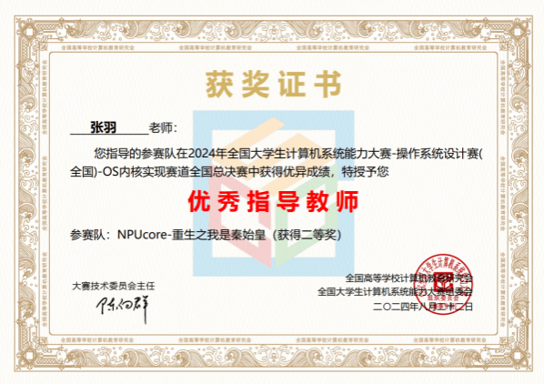 张羽教授带领的“NPUcore”战队从来自清华大学、北京大学、上海交通大学、哈尔滨工业大学、北京航空航天大学、华中科技大学等全国百余所高校209支入围总决赛的队伍中脱颖而出,获得了“操作系统设计”赛内核实现赛道(基于国产龙芯LoongArch硬件)全国总决赛一等奖1项(全国冠军)、二等奖2项(亚军和季军),一举包揽该赛道全国总决赛前三名。