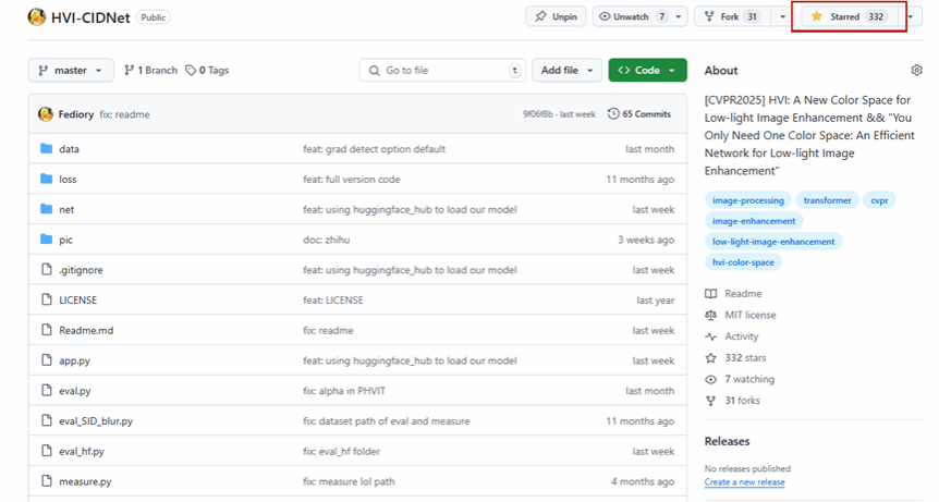 结合设计的增强网络,赋予算法动态学习能力,该成果在10个低光增强数据集上展现出领先性能(如图2),其模型在 paper with code排行榜上持续霸榜。项目 GitHub 开源一周即获330+星标(如图3),已经有超10个科研组织发邮件咨询相关合作项目,并已被知名开源网站抱抱脸(Hugging Face)模型库收录。这项成果不仅开拓了计算机视觉科研的新方向,还具备参数量和计算量小的优势,能够适配手机、无人机等边缘设备,对自动驾驶、监控、医学影像处理等工业化领域具有重要意义和里程碑式价值。