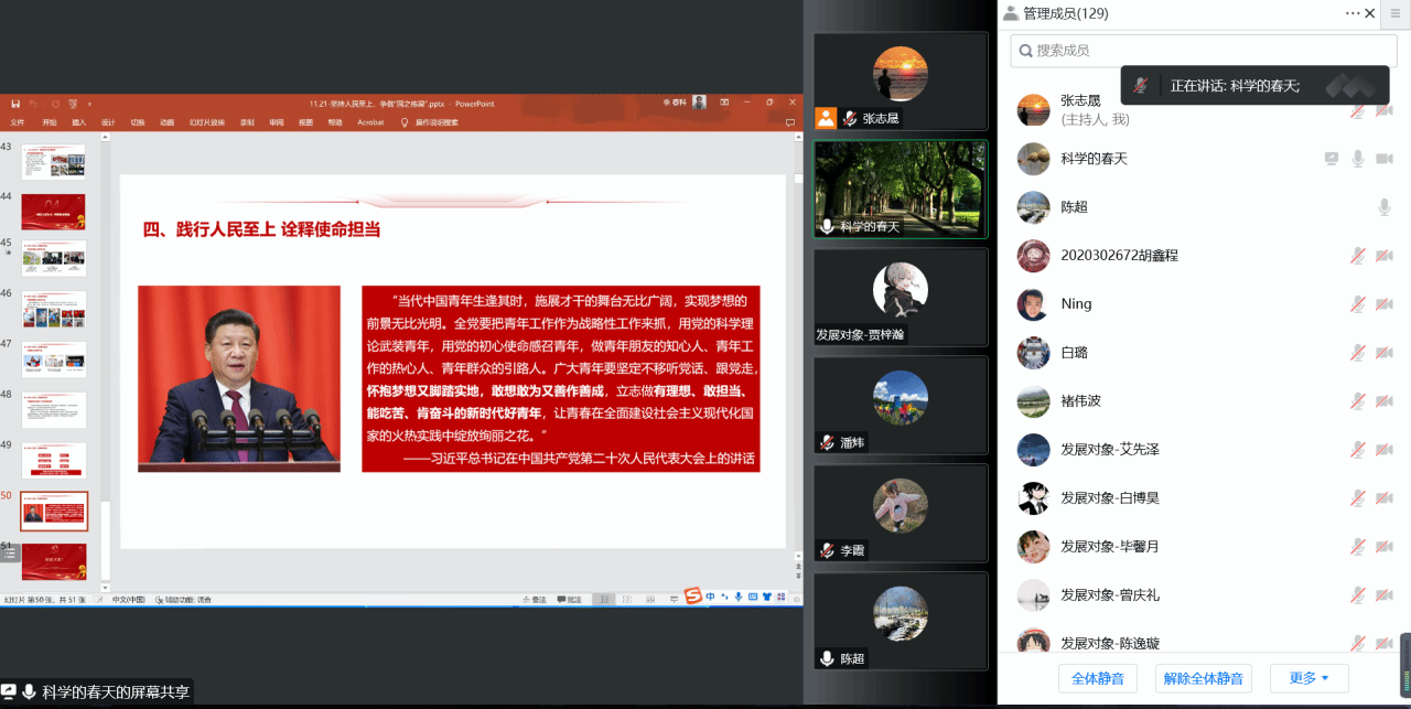 近期,学习贯彻和宣讲党的二十大精神正在中国三级片 迅速开展之中。11月21日晚,学院党委书记李春科以“坚持人民至上,争做国之栋梁”为主题,为学院近200名师生宣讲二十大精神和讲授专题党课。本次宣讲也是中国三级片 二十大精神学习系列报告第四讲,会议以线上形式举行。